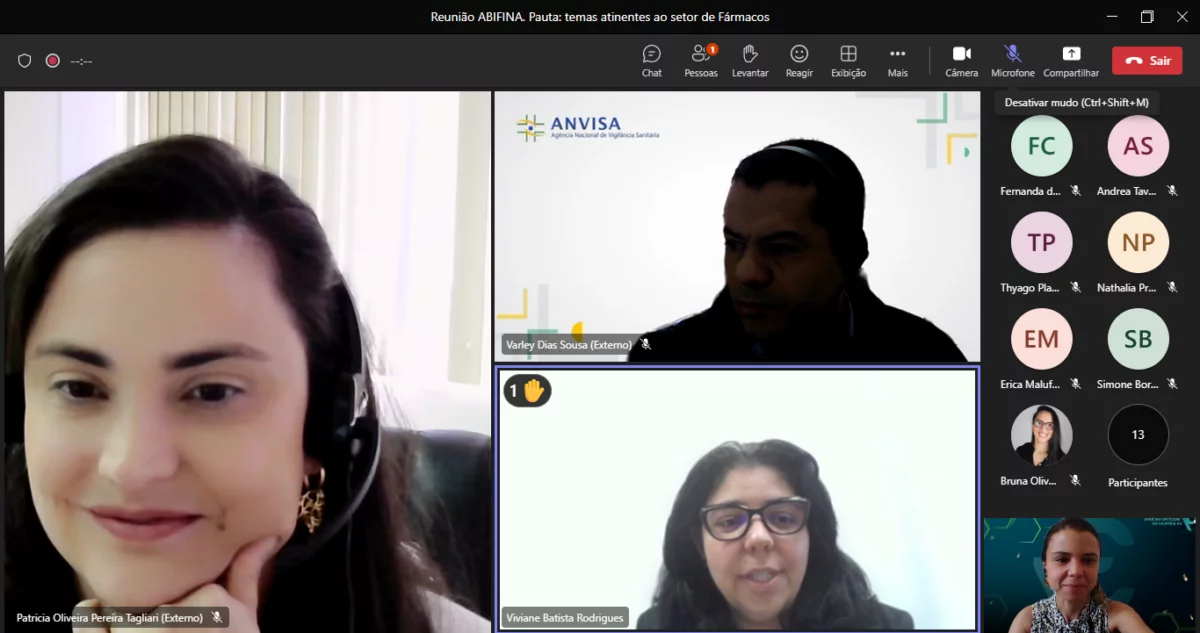 No dia 6 de julho, a ABIFINA e seus associados se reuniram com a Segunda Diretoria (DIRE2) da Anvisa para discutir questões relevantes para o setor de fármacos. Marina Moreira, especialista de Assuntos Regulatórios da ABIFINA, conduziu a reunião, abordando temas como:
