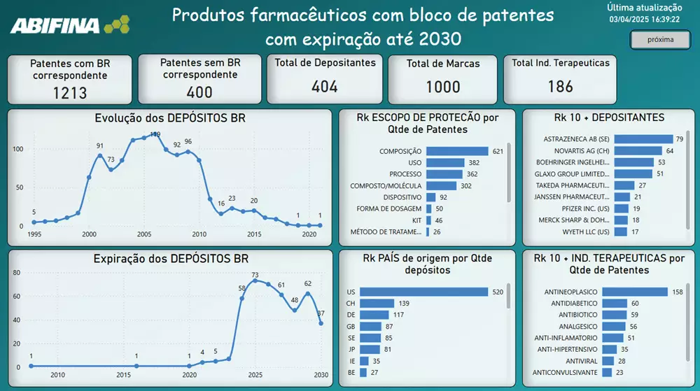 Com o objetivo de fomentar a produção local e reduzir a dependência externa de insumos e de medicamentos, a ABIFINA elaborou um estudo com mais de 1.500 patentes de produtos farmacêuticos que irão expirar até 2030. Essas patentes formam blocos de proteção para mil produtos que estarão livres para produção e comercialização nesse período.